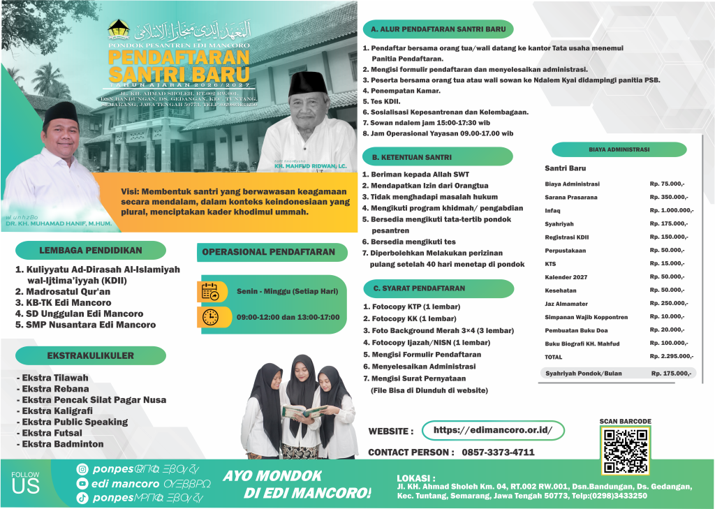 BROSUR Lokasi : Ponpes Edi Mancoro 1, Jl. KH. M Sholeh Km. 04, RT.002 RW.001, Dsn.Bandungan, Ds. Gedangan, Kec. Tuntang, Semarang, Jawa Tengah 50773, Telp: (0298)343325. Ponpes Edi Mancoro 2, MFF8+VQV, Gedagan, Gedangan, Kec. Tuntang, Kabupaten Semarang, Jawa Tengah 50773.Telp: (0298)343325. Kontak: 085733734711 [email protected] (0298)343325. Follow Me: Facebook Youtube Instagram Tiktok X-twitter