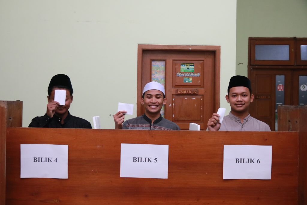 Dengan penuh antusias, para santri menggunakan hak pilihnya untuk menentukan pemimpin yang akan mengemban amanah selama satu periode ke depan. Proses pemilihan berlangsung tertib dan lancar hingga akhirnya menetapkan Guntur Wicaksana sebagai Lurah Putra dan Umi Nadziroh sebagai Lurah Putri terpilih.